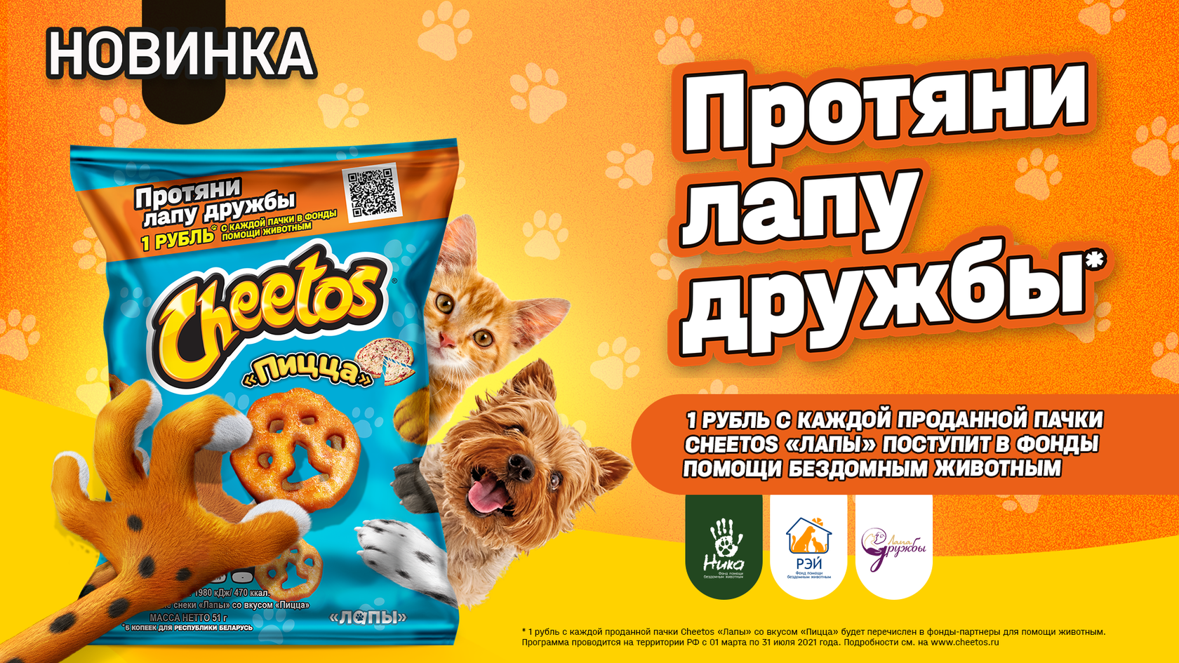 В рамках кампании 1 рубль с каждой проданной пачки Cheetos «Лапы» со вкусом «Пицца» перечисляется в фонды помощи бездомным животным: «Ника», «РЭЙ» и "Лапа дружбы". На сайте charity.cheetos.ru каждый желающий может выбрать свой формат участия в благотворительной инициативе: оставить заявку на поездку в приют, купить пачку Cheetos и тем самым сделать пожертвование в фонд помощи бездомным животным или забрать домой лохматого друга. Важным блоком кампании стало сотрудничество бренда с TikTok домом «Dream Team House».